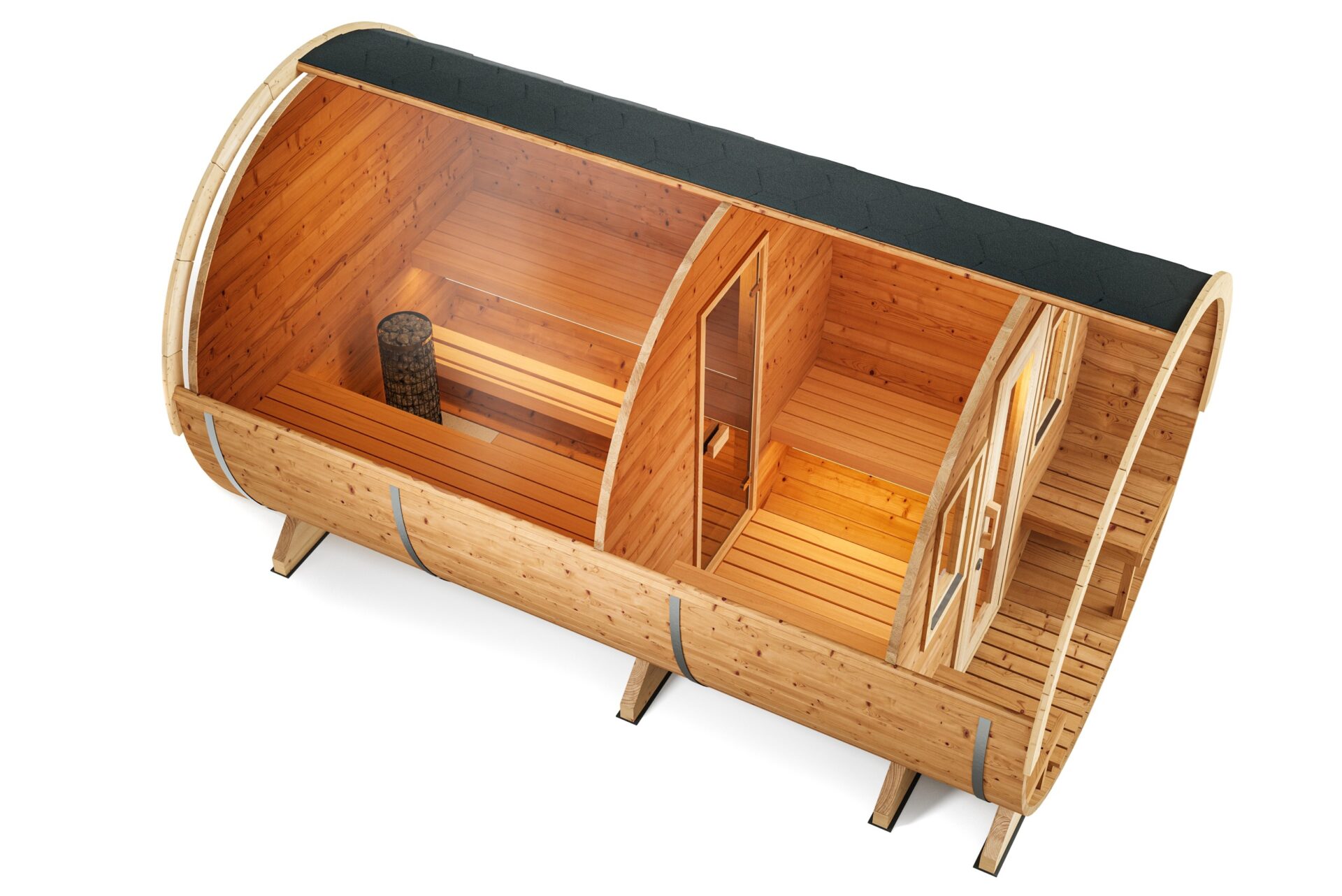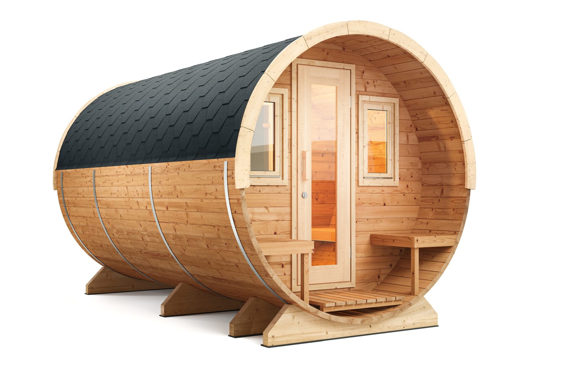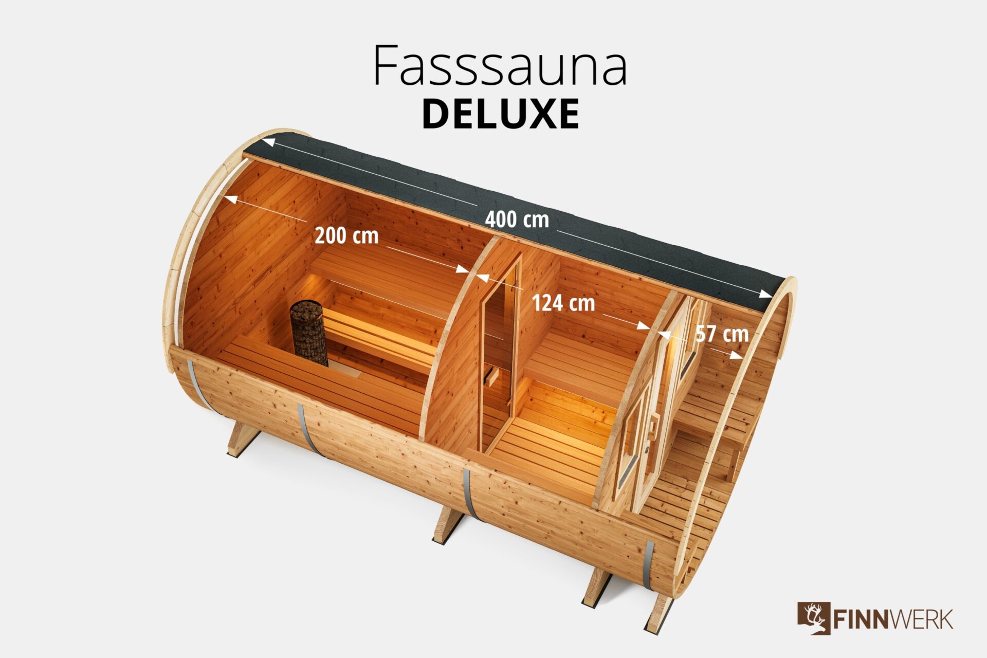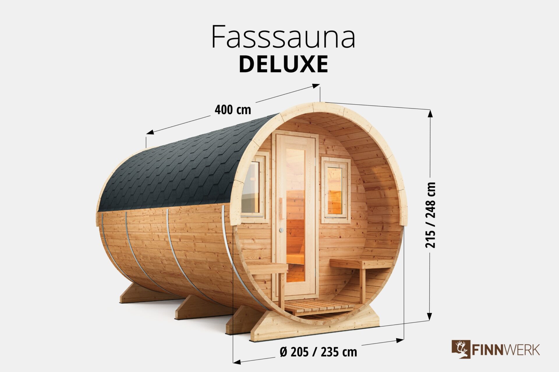 Finnwerk Fasssauna Deluxe Unser Luxusmodell der Fasssauna mit Terrasse und Vorraum für bis zu 7 Personen. Die exklusive Bauform des Saunafasses mit überdachter Terrasse passt nicht nur optisch harmonisch in Deinen Garten, sondern bietet durch die spezielle Bauart auch optimalen thermischem Wirkungsgrad. Beim Saunaofen kann zwischen Holzofen und Elektroofen gewählt werden. Bei beiden Heizarten verbauen wir für den deutschen Markt optimierte und langlebige Markenöfen der Firma Harvia. Zum Entspannen laden 2,00 m lange Saunaliegen aus Erlenholz im Inneren der Fasssauna ein. Durch die Holztür mit Sichtfenster betrittst Du den knapp 1,30 m langen Vorraum des Saunafasses. Der Saunaraum ist durch eine Glastür aus bronzefarbenem Sicherheitsglas aus dem Vorraum zugänglich. Vier Fenster, zwei im Saunaraum und zwei im Vorraum, ermöglichen schon während dem Saunabad den Genuss der Natur. Alle Elemente der Sauna, von der Dachverblendung bis zur Fensterplatzierung sind konfigurierbar. Spreche uns an!Terrasse und VorraumDie Terrasse der Fasssauna lädt mit seinen zwei knapp 60cm breiten Bänken zum Relaxen und Abkühlen zwischen den Saunagängen ein. Der in das Saunafass integrierte Vorraum eignet sich mit zwei Sitzbänken hervorragend als Umkleide und zum Ablegen von Saunahandtüchern und Saunazubehör.EckdatenMaterial:Fichte, Thermoholz / BitumenschindelnMaße (Ø x L):205 x 400 cmVolumen Sauna:~6,6 m³Beheizung:Holz- / ElektroofenKapazität:4-7 PersonenWandstärke:40-42 mmSaunaraum:200 cmVorraum:127 cmTerrasse:57 cmGewicht:1020 kgDas beliebte Schwitzbad ist Lebenskultur pur und wirkt sich rundum positiv auf Körper, Geist und Seele aus. Ein Besuch in der Sauna fördert die Gesundheit, stärkt das Immunsystem, fördert die Durchblutung und reinigt die Haut. Besonders empfehlenswert sind Saunagänge nach sportlichen Aktivitäten, da sich durch die verbesserte Durchblutung Verspannungen lösen. Gleichzeitig kann der Saunagang die Regeneration von Muskelkater, kleinerer Muskelverletzungen und Zerrungen beschleunigen. Auch bei akuten Beschwerden und Schmerzen im Bewegungsapparat hilft ein Gang in die Fasssauna. Denn bei der Wärmebehandlung werden Glückshormone ausgeschüttet, die schmerzstillend und euphorisierend wirken. Das Saunieren ist nicht nur gut für die Erholung, sondern hilft auch beim stärken Deines Immunsystems. Die Körpertemperatur erhöht sich, es weiten sich die Blutgefäße in der Haut und man beginnt zu schwitzen. Schwitzen hilft dem Körper sich auf natürliche Art von innen heraus zu reinigen. Aufgrund der Hitze in der Sauna und dem Abkühlen danach wird nicht nur auf entspannte Weise der Kreislauf angeregt, sondern man gewöhnt sich auch an die Temperaturunterschiede in der kalten Jahreszeit und beugt gleichzeitig Erkältungen vor. Mit dem eigenem Saunafass verwandelst Du Deinen Garten in eine private Wellnessoase mit Wohlfühlcharakter für Leib und Seele. Montage Fasssauna Bausatz Montiert Holzart Fasssauna Fichtenholz Thermoholz Durchmesser Fasssauna 2,05m 2,35m Clear Ab 6.000,00 €