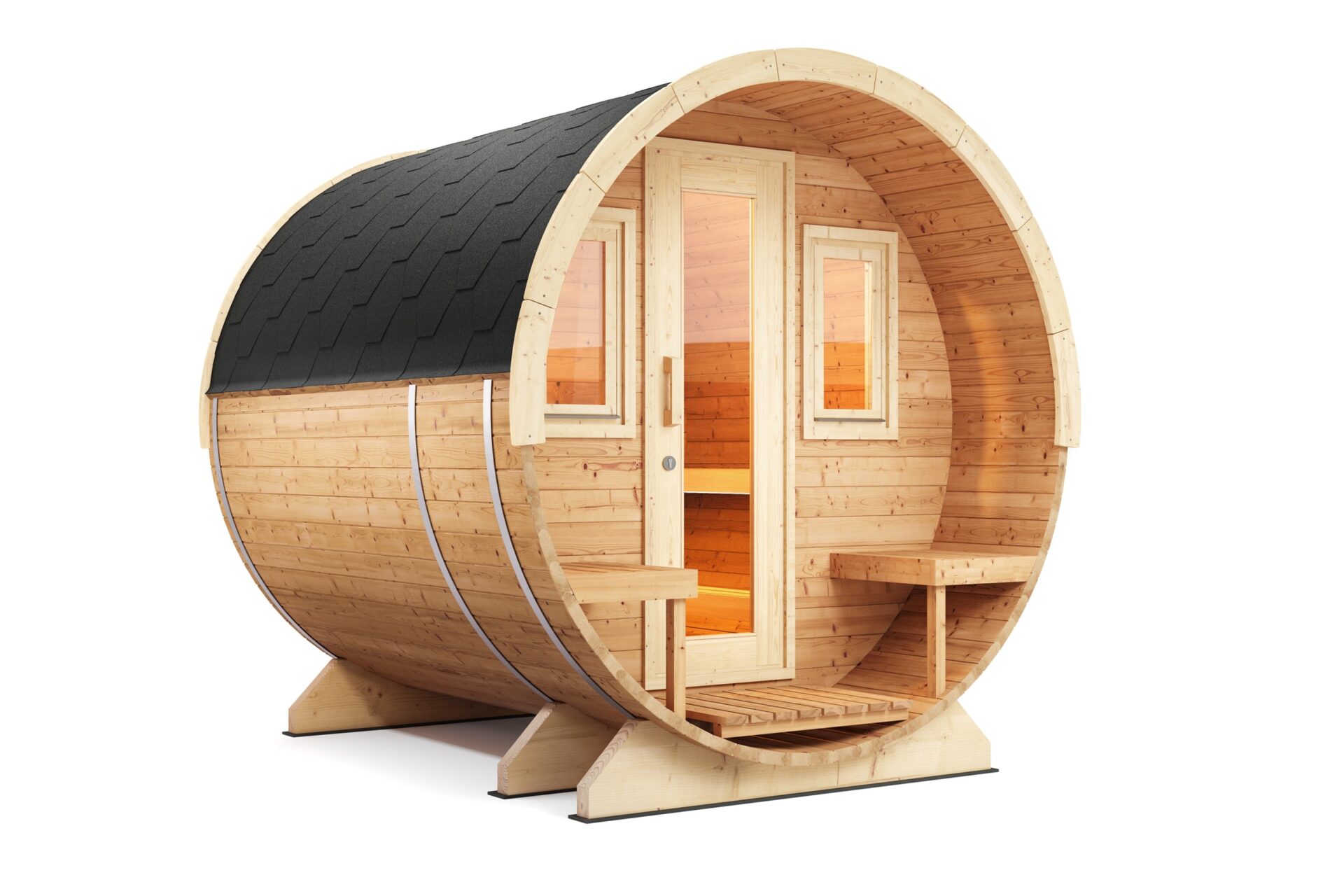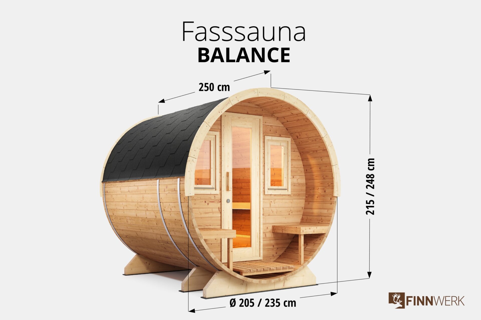 Finnwerk Fasssauna Balance Dieses Modell der Fasssauna für bis zu 4 Personen ist durch seine aufgerichtete Form besonders platzsparend und findet in kleinsten Gärten Platz. Die kompakte Bauform des Saunafasses mit Runddach passt nicht nur optisch harmonisch in Deinen Garten, sondern bietet durch seine spezielle Bauart eine optimale thermische Wirkung. Bei dem Saunaofen kannst Du zwischen Holzofen und Elektroofen wählen. Bei beiden Heizarten verbauen wir für den deutschen Markt optimierte und langlebige Markenöfen der Firma Harvia. Zum Entspannen laden zwei Sitzbänke aus Erlenholzim Inneren der Fasssauna ein. Durch eine in die Sauna eingebaute Holztür mit Fenstereinsatz und zwei Sichtfenster wird der Genuss der Natur auch während des Saunabades möglich. Alle Elemente der Sauna, von der Dachverblendung bis zur Fensterplatzierung sind konfigurierbar.EckdatenMaterial:Fichte, Thermoholz / BitumenschindelnMaße (Ø x L):205 x 250 cmVolumen Sauna:~6 m³Beheizung:Holz- / ElektroofenKapazität:2-4 PersonenSaunaraum:180 cmTerrasse:57 cmGewicht:680 kg Das beliebte Schwitzbad ist Lebenskultur pur und wirkt sich rundum positiv auf Körper, Geist und Seele aus. Ein Besuch in der Sauna fördert die Gesundheit, stärkt das Immunsystem, fördert die Durchblutung und reinigt die Haut. Besonders empfehlenswert sind Saunagänge nach sportlichen Aktivitäten, da sich durch die verbesserte Durchblutung Verspannungen lösen. Gleichzeitig kann der Saunagang die Regeneration von Muskelkater, kleinerer Muskelverletzungen und Zerrungen beschleunigen. Auch bei akuten Beschwerden und Schmerzen im Bewegungsapparat hilft ein Gang in die Fasssauna. Denn bei der Wärmebehandlung werden Glückshormone ausgeschüttet, die schmerzstillend und euphorisierend wirken. Das Saunieren ist nicht nur gut für die Erholung, sondern hilft auch beim stärken Deines Immunsystems. Die Körpertemperatur erhöht sich, es weiten sich die Blutgefäße in der Haut und man beginnt zu schwitzen. Schwitzen hilft dem Körper sich auf natürliche Art von innen heraus zu reinigen. Aufgrund der Hitze in der Sauna und dem Abkühlen danach wird nicht nur auf entspannte Weise der Kreislauf angeregt, sondern man gewöhnt sich auch an die Temperaturunterschiede in der kalten Jahreszeit und beugt gleichzeitig Erkältungen vor. Mit dem eigenem Saunafass verwandelst Du Deinen Garten in eine private Wellnessoase mit Wohlfühlcharakter für Leib und Seele. Montage Fasssauna Bausatz Montiert Holzart Fasssauna Fichtenholz Thermoholz Durchmesser Fasssauna 2,05m 2,35m Clear Ab 4.500,00 €
