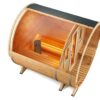 Dieses Modell der Fasssauna für bis zu 4 Personen ist durch seine aufgerichtete Form besonders platzsparend und findet in kleinsten Gärten Platz. Die kompakte Bauform des Saunafasses mit Runddach passt nicht nur optisch harmonisch in Deinen Garten, sondern bietet durch seine spezielle Bauart eine optimale thermische Wirkung. Bei dem Saunaofen kannst Du zwischen Holzofen und Elektroofen wählen. Bei beiden Heizarten verbauen wir für den deutschen Markt optimierte und langlebige Markenöfen der Firma Harvia. Zum Entspannen laden zwei Sitzbänke aus Erlenholzim Inneren der Fasssauna ein. Durch eine in die Sauna eingebaute Holztür mit Fenstereinsatz und zwei Sichtfenster wird der Genuss der Natur auch während des Saunabades möglich. Alle Elemente der Sauna, von der Dachverblendung bis zur Fensterplatzierung sind konfigurierbar.