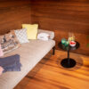 Die Oberflächen von Lounge und Sauna wurden aus denselben Materialien gefertigt: Die Außenverkleidung besteht aus Fichtenholzpaneelen und die Innenflächen aus wärmebehandelter Laubholz.